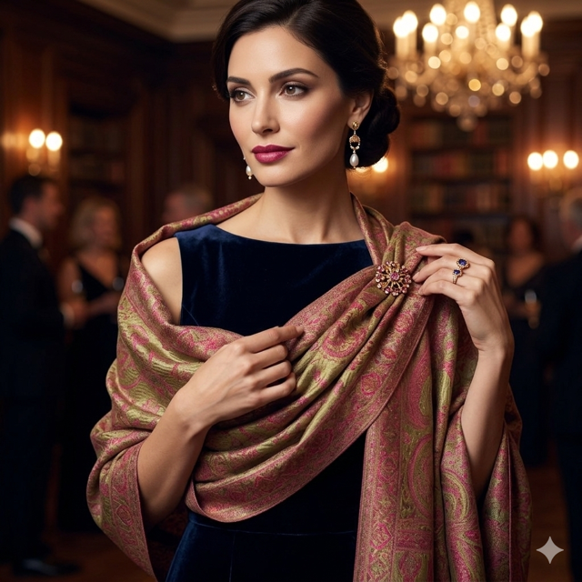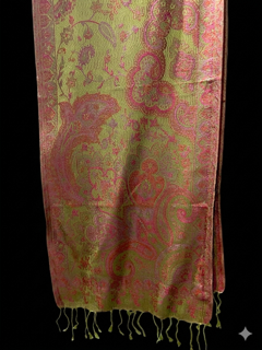 Small silk scarf, harmonious light green, and light red colours with paisley designs.
