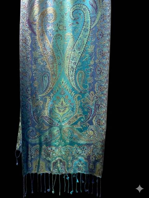 Small silk scarf, harmonious light and dark turquoise and purple colours with paisley designs.