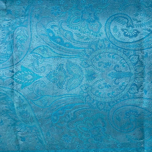Small silk scarf, harmonious light blue colours with paisley designs.